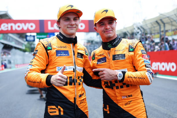 Sao Paulo, Brasil – 2/11/24: Lando Norris (derecha) y Oscar Piastri (izquierda) celebran el primer y segundo puesto respectivamente en la carrera al sprint en el Autódromo José Carlos Pace (Foto de Lars Baron – Formula 1/Formula 1 vía Getty Images)